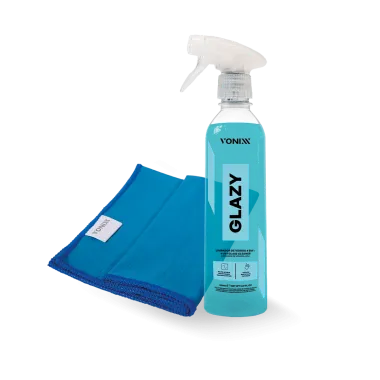GLAZY é um produto 4 em 1, de alta tecnologia, desenvolvido para vidros em geral, que limpa, protege, condiciona e atua como redutor de riscos. O produto contém polímeros especiais que reduzem o atrito no vidro, diminuindo as chances de riscos causados por limpadores de para-brisas e movimentações dos vidros laterais. Deixa um toque liso e aspecto de vidro novo